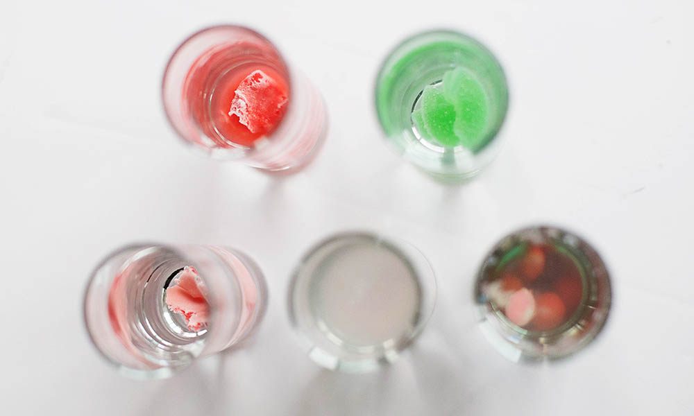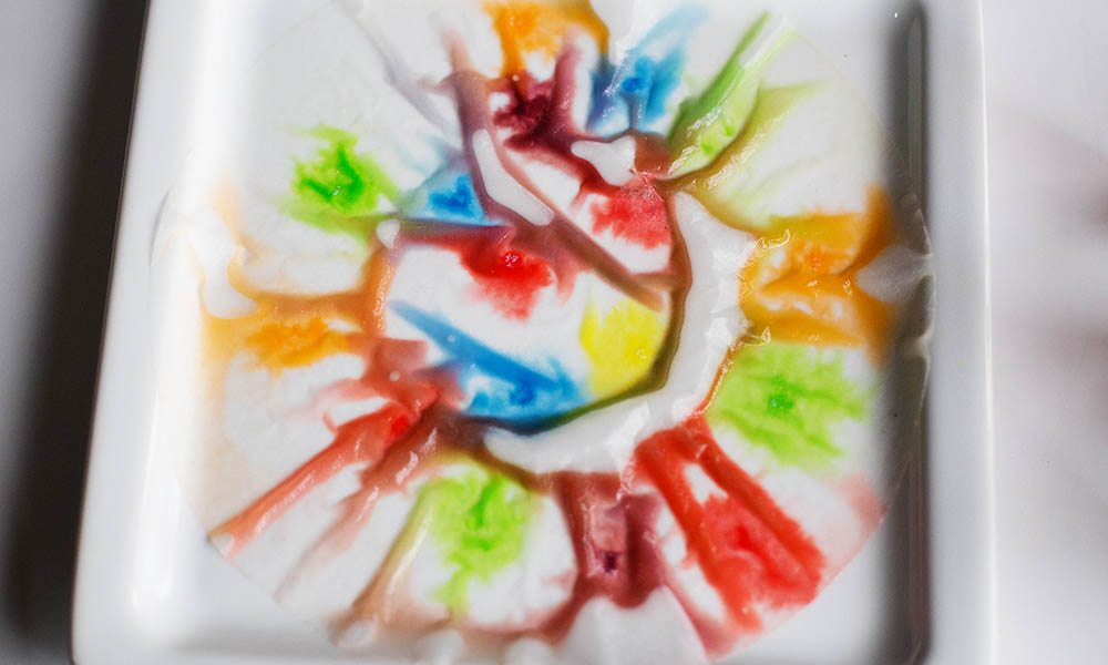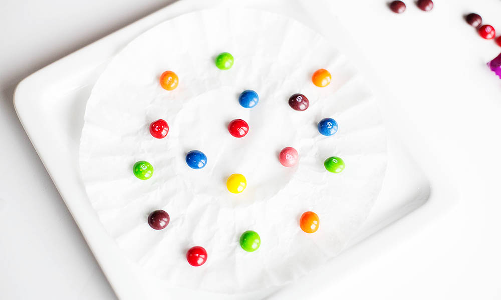 One of our favorite and most colorful experiments involves Skittles and some water. Add a bit of water to a plate and place a few Skittles around the plate.