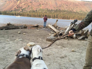 - Problem solving – how to move a heavy log, how to keep the dogs from getting their tie-outs tangled in camp, how to keep the fire going (with supervision from my husband).